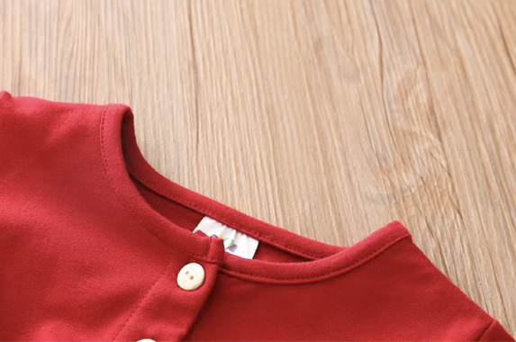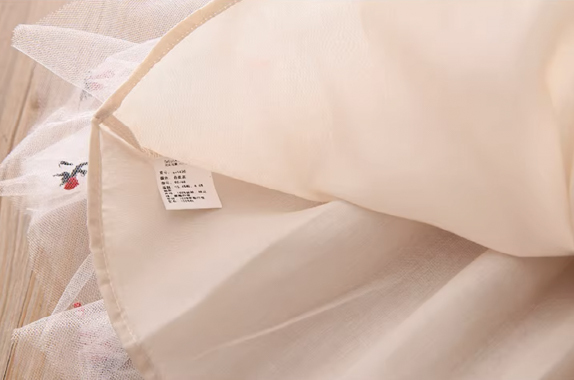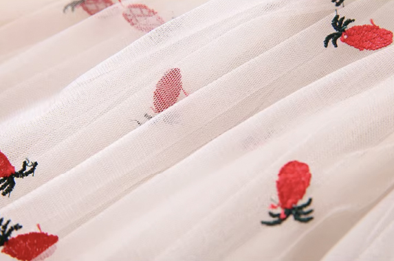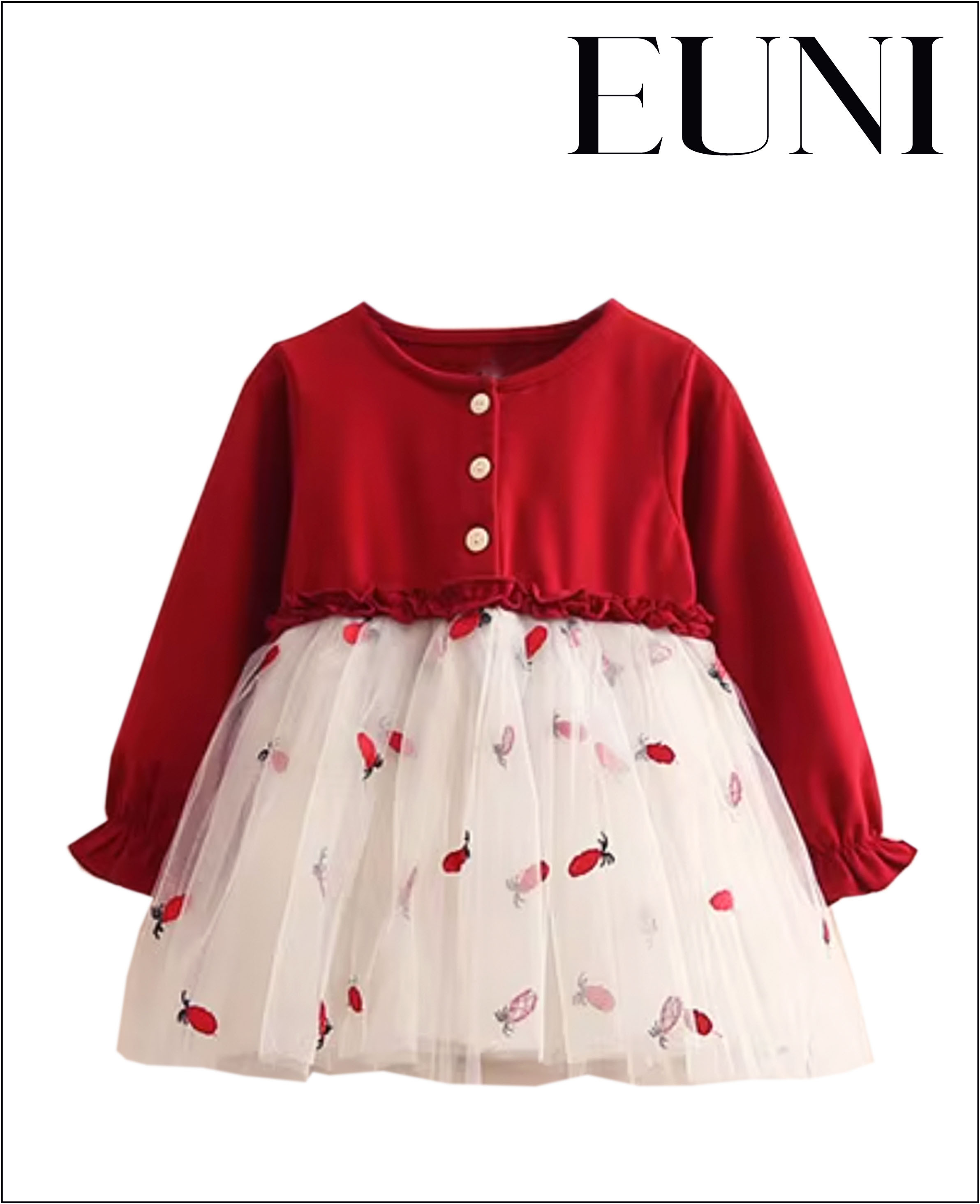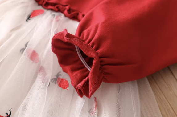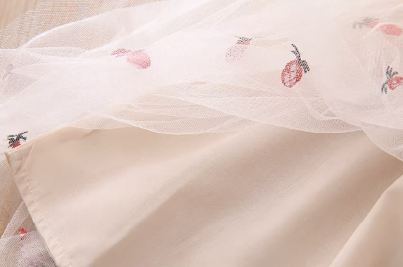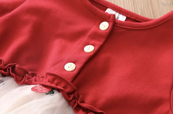 女童長袖裙裝;裙襬網紗設計;可愛排扣設計;純棉、聚酯纖維材質;可愛典雅風格。