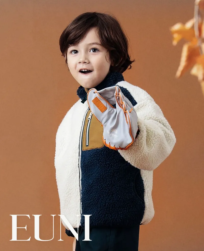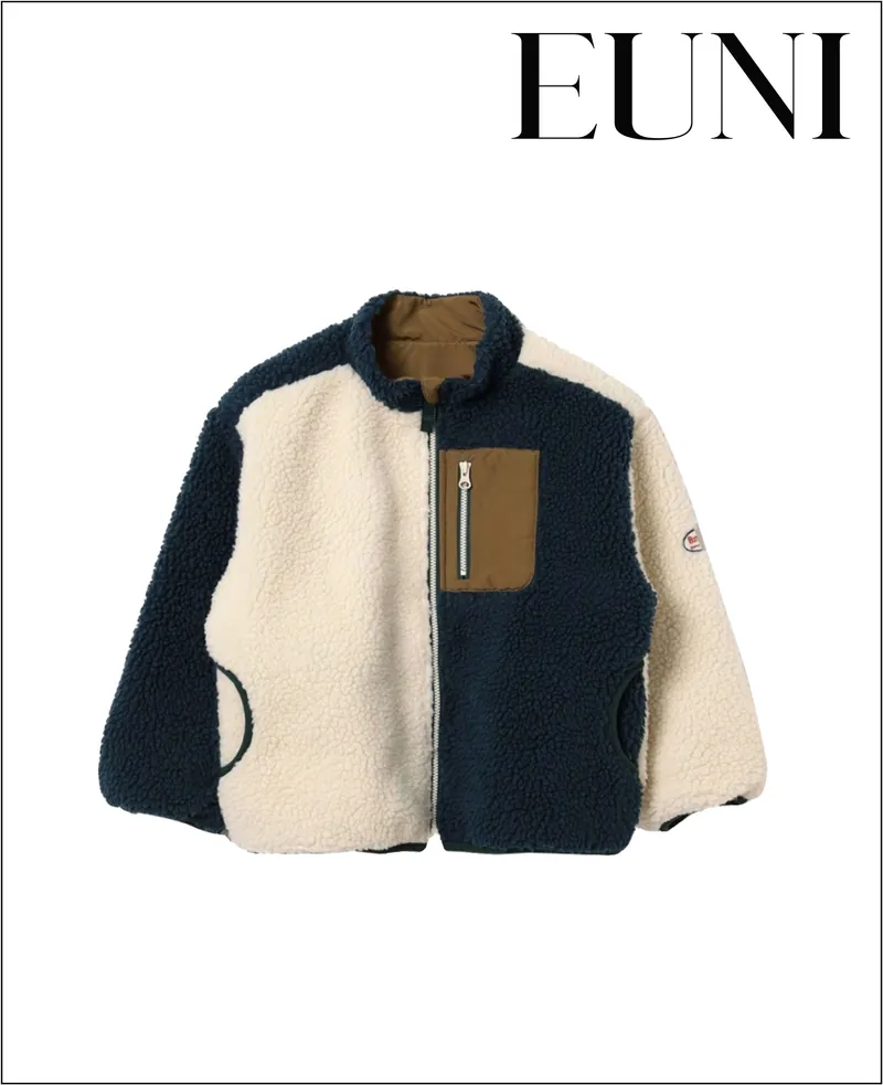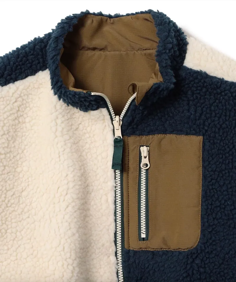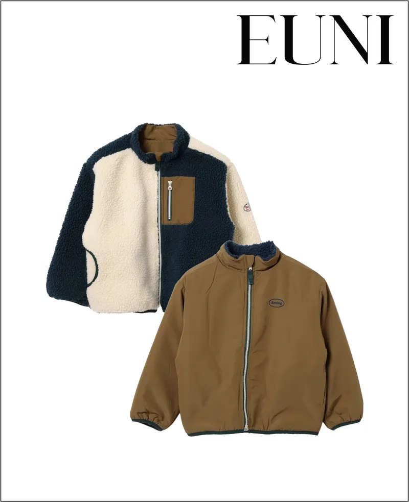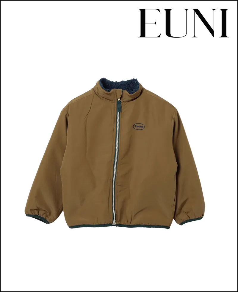 兒童立領外套;雙面穿搭;A面為仿羊羔榮材質;B面為特殊防潑水材質。