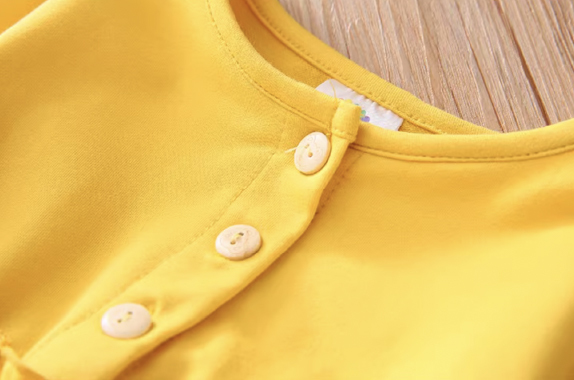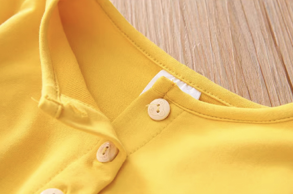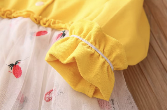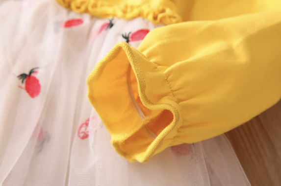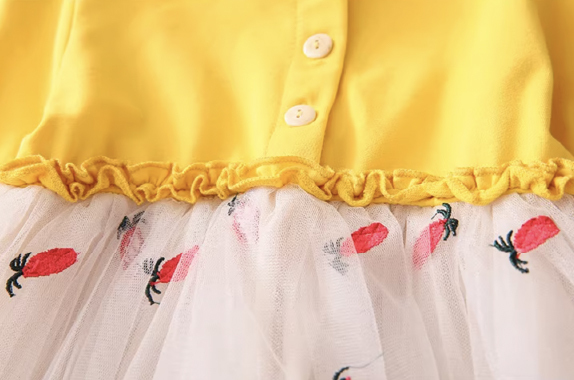 女童長袖裙裝;裙襬網紗設計;可愛排扣設計;純棉、聚酯纖維材質;可愛典雅風格。