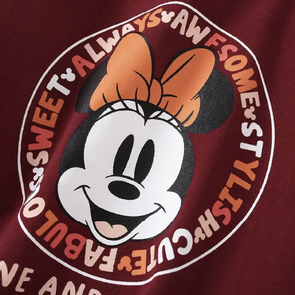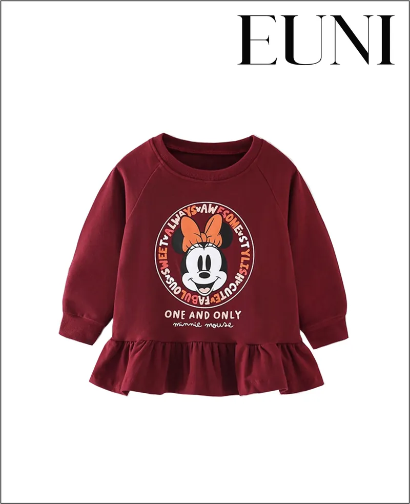女童長袖裙裝;米妮印花設計;純棉材質;可愛風格。